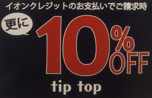2014.09.13 - 福津店☆【3日間限定】イベント情報! 皆様おひさしぶりです! 福津店の満生です。 今回はとってもお得なイベントのお知らせです!!!! ただ今tiptopでは10%OFFのイベントを行っております! なんと福津店ではイオンクレジットのお支払いで、更に10%OFFになります☆(ご請求時) 期間中、即日発行もできるのでイオンカードをお持ちでない方もまだ間に合いますよ♪ お得に秋物がGETできる大チャンス!! ぜひこの機会にtiptop福津店にお越しくださいませ(*^^*)