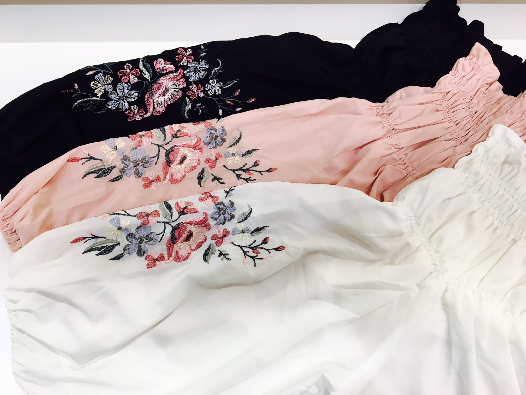 こんにちは!熱田店の古川です☺ 本日はスタッフのおすすめアイテムをご紹介いたします! ▽袖花刺繍オフショルブラウス¥2990+tax お袖にトレンドの刺繍が✿✿✿ collar:ク