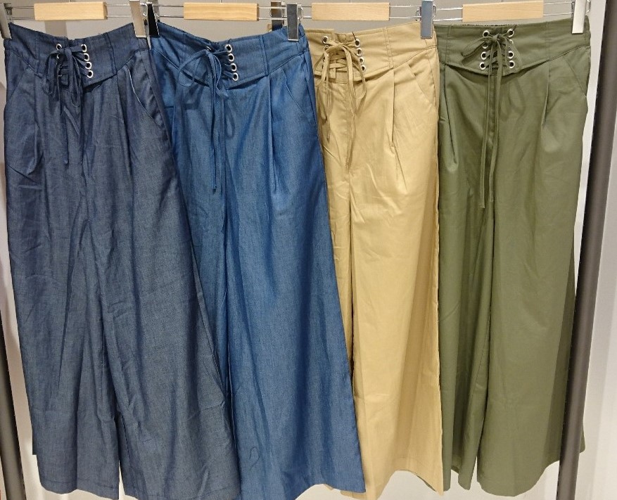 こんにちは! 長久手店の井草です! 今回は新作のワイドパンツをご紹介します。 Wレースアップワイドパンツ¥5.990+税→¥2,990+税 生地がてろっ