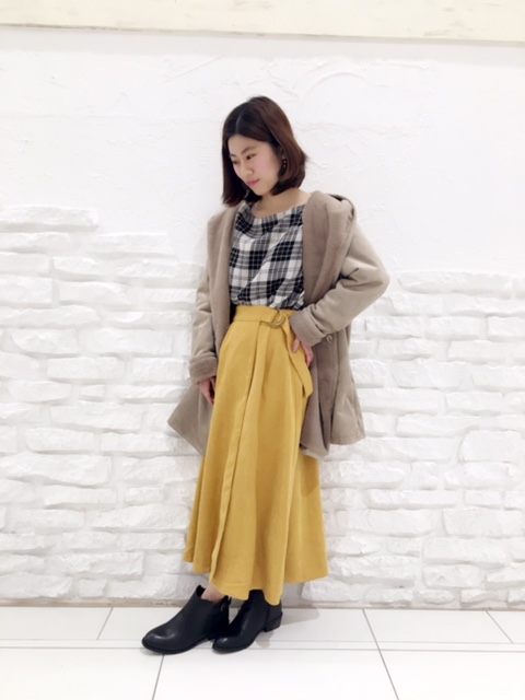 こんにちは☆ 鈴鹿店です。 最近寒くなってきましたね(-_-;) そんな時に着たくなるコーデをご紹介します♡ イエローのラップスカートがさし色になって可愛いです☆ ム