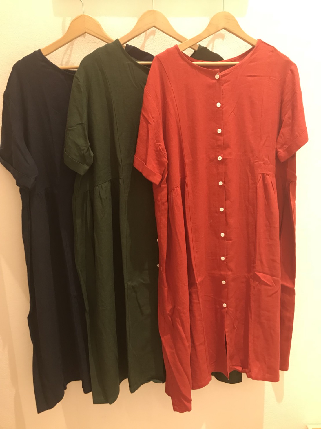 こんにちは! 高崎店から新作商品をご紹介致します! 2wayゆったりワンピース ¥4990+tax ベージュ、アカ、グリーン、コンの4色です。 前後着用