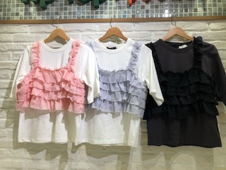 こんにちは! 高崎店から新作商品をご紹介します! ティアードビスチェ半袖Tセット ¥3990+tax カラーはアカ クロ コンの3色です。