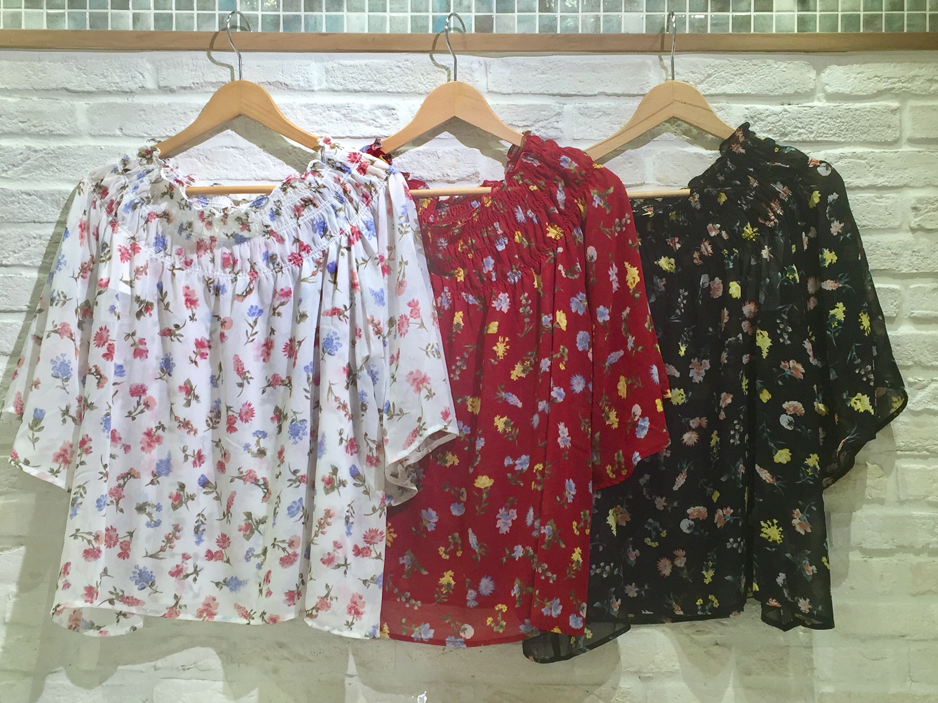 みなさま、こんにちは! 今回はトレンドのオフショルブラウスにフレア+5分袖ver.が登場したので ご紹介していきます!! 夏らしい花柄と無地の6種類です。 お袖は涼し
