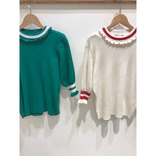 こんにちは! 常滑店より、新作のご紹介です(^^) ライン入りリブニット ¥3.990+ tax 襟と袖のラインが今年っぽくて、とって