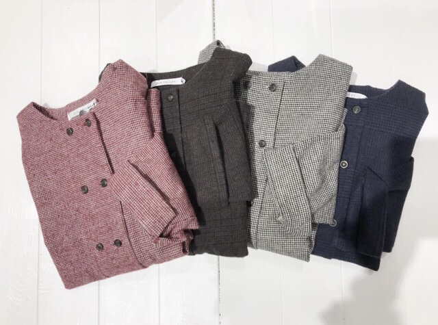 こんにちは!津田沼店です(^^) 本日は秋のおすすめ、ポケットの新作アイテムをご紹介します♪ ▽ ▽ ▽ ▼ ノーカラージャケット (color → キナリ/エンジ/ブラウン/コン