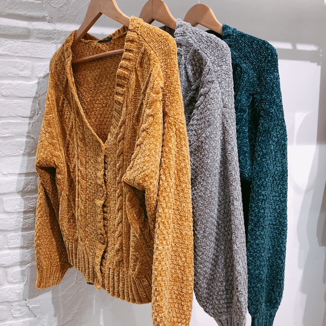 こんにちは!!^o^ 国分寺店が新作商品を使ってコーディネートしてみました! カーディガンが新作なのですが、チクチクしないベロア素材なのでとても気安いですよ! 袖にボリュームもあり