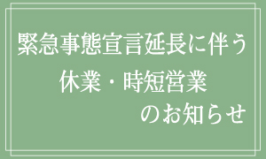 平素は格別のご愛顧を賜り厚く御礼申し上げます。 緊急事態宣言延長に伴い、休業・営業時間の短縮を行っています。 政府の判断により延長や前倒して通常営業となる場合がございます。 詳細に